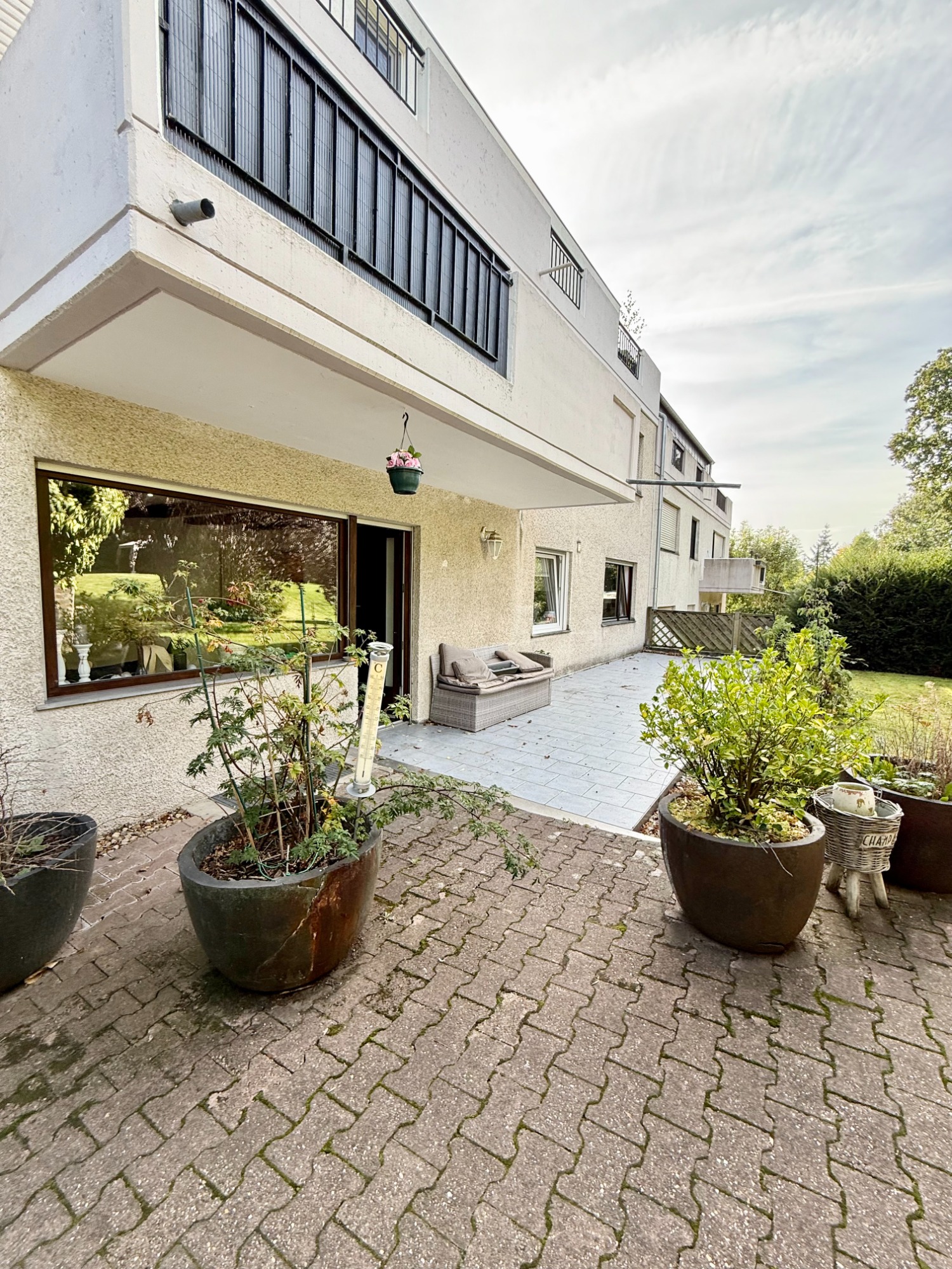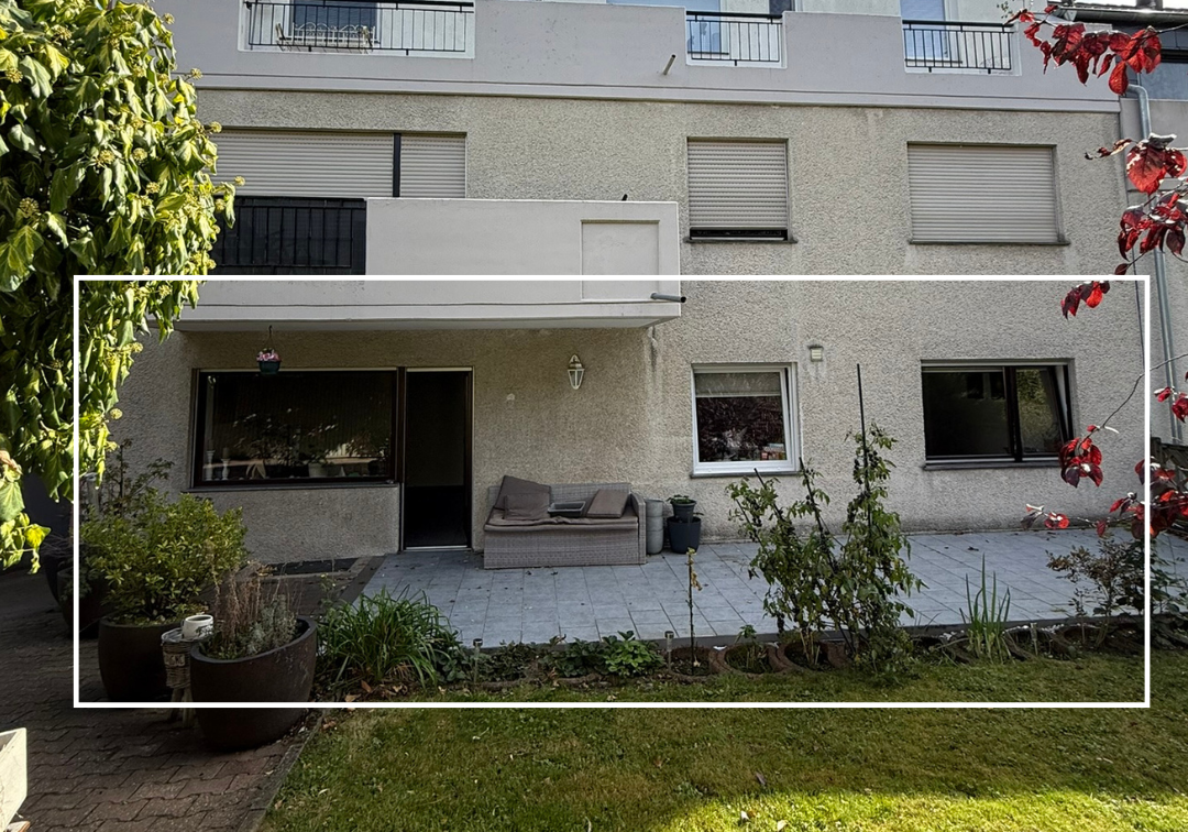 Trotz der zentralen Lage bietet die Wohnung einen angenehmen Rückzugsort: die Terrasse mit angrenzender Grünfläche schafft eine kleine Ruheoase mitten im Alltag.